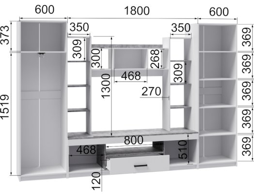 Ниша под ТВ (ШхВхГ): 1100х850х470 мм