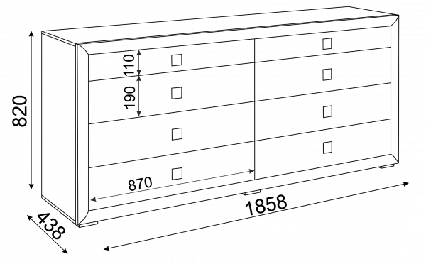 • Комод имеет 8 выдвижных ящика без разделителей.