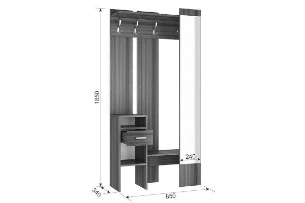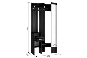 «Агата» создана для Вашей прихожей – Вы можете повесить одежду и сумку на металлические крючки, шляпки положить на полку сверху, нужные мелочи – в выдвижной ящик. На открытых полках можно разместить зонты, перчатки и шарфы. Лицевая панель с зеркалом во весь рост обеспечит комфорт и уют Вашей прихожей. «Агата» - стильная, функциональная, занимает минимум пространства.