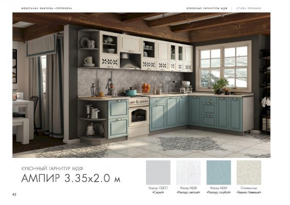 Хотите готовить и проводить время на кухне с удовольствием? Укомплектуйте помещение красивой и удобной мебелью — закажите гарнитур «Ампир»! Комплект эстетичен и функционален. В него входят все необходимые для создания идеальных условий элементы. Холодные оттенки поддерживают праздничное, романтическое настроение. Немного гламура в обстановку вносят прорезные орнаменты на дверцах подвесных шкафчиков.
