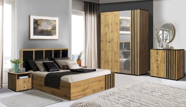 Дизайн кровати заслуживает особого внимания. Пять вставок из черного велюра нанесены на изголовье кровати. Это смотрится гораздо более стильно, чем сплошное изголовье. К тому же удачно перекликается с визитной карточкой коллекции – комбинацией фасадной рейки. Принцип тот же – на фоне теплого дерева (основа МДФ) контрастно выделяются черные вертикальные вставки. На изголовье – из мягкого велюра, на изножье – из реек в пленке ПВХ. Контраст усиливается размером и фактурой вставок. Велюровые – мягкие и широкие, реечные – твердые, тонкие и изящные. Накладки делают элементы объемными, что придает особый шарм. Высокое изголовье и низкое изножье – удобно и практично. На мягкое изголовье можно опереться, как на диванную подушку, а у низкого изножья нет ограничений по длине.