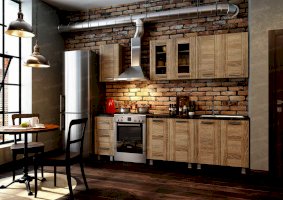 Для тех, кому по душе чердачная романтика, представлен кухонный гарнитур «Лофт». Искусная стилизация под натуральную древесину отлично сочетается с большими окнами, отделкой из кирпича и камня, не крашенными металлическими трубами. Несмотря на внешнюю простоватость, комплект не перегружает интерьер, напротив, он делает обстановку раскрепощенной и ненавязчивой.
