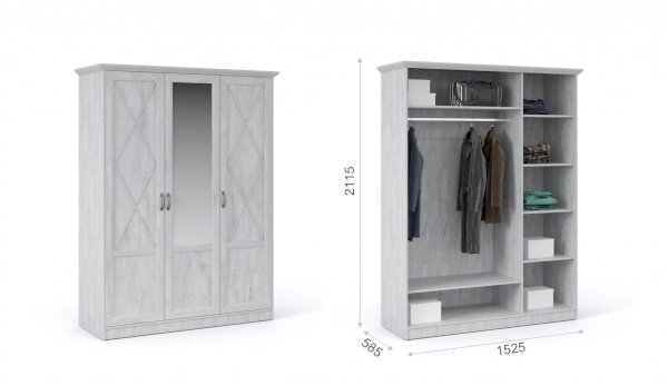Распашной трехдверный шкаф выполнен в популярном стиле неоклассика – белые рамочные фасады с фактурой и рисунком натурального дерева, декоративные крестообразные накладки, фигурные ножки и карниз все это придает комнате элегантный и светлый вид. Вместительные отделения со штангой и полками поместит в себя верхнюю одежду, коробки с обувью и головные уборы. Мебель выполнена из экологичных материалов.