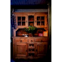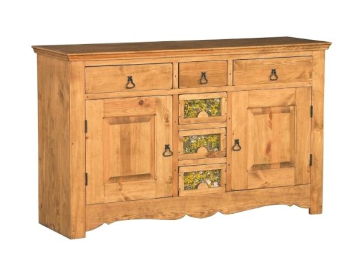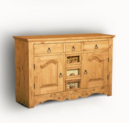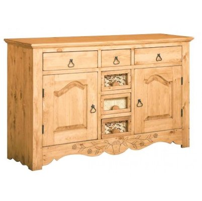 Буфет из массива сосны ENSEMBLE 150. Широкий буфет оценят и любители оригинальных интерьеров, и практичные хозяева. Комплект из нижней тумбы и верхнего буфета выполнен в стиле Прованс. За стеклянными дверцами можно хранить праздничные сервизы, семейные раритеты, интерьерные вещицы.  Задние стенки всех буфетов набраны из дощечек массива сосны. Также из массива сосны набраны днища ящиков. В конструкции нет элементов из фанеры, ДСП, или МДФ.