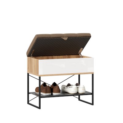 • Банкетка установлена на опорный металлический каркас со стационарной металлической полкой для обуви (полка с перфорацией)