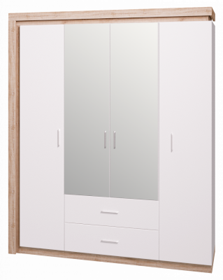 Шкаф для одежды с ящиками 4-х дверный с зеркалом №16 Дуб сакраменто/Белый снег глянец