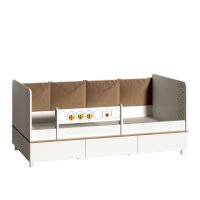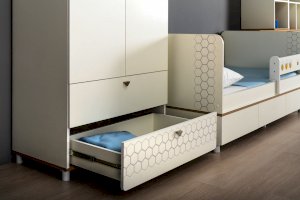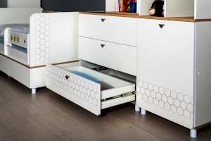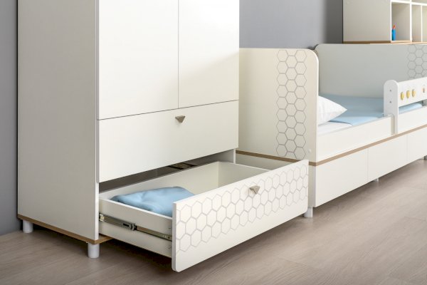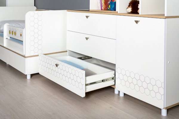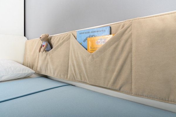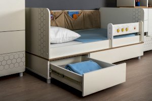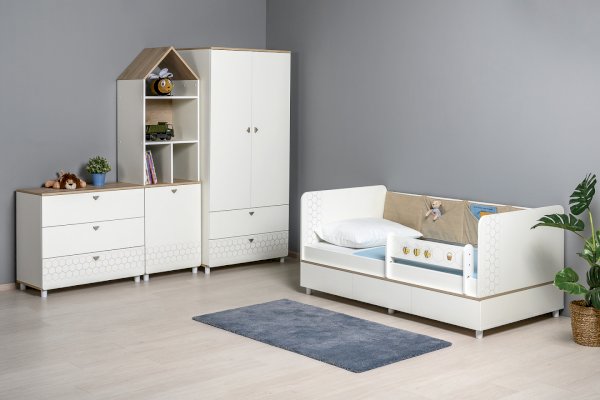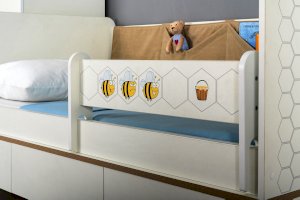 Кровать оснащена съёмным мягким элементом с карманами, передвижным бортиком и декорирована оригинальным рисунком - мультяшными пчёлками, которые никого не оставят равнодушным.