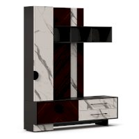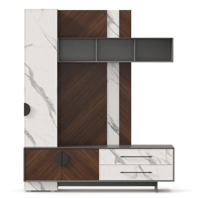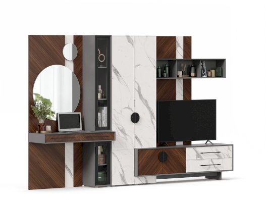 - Модуль скомбинирован из наборной панели, шкафа одностворчатого, тумбы для ТВ и открытых полок