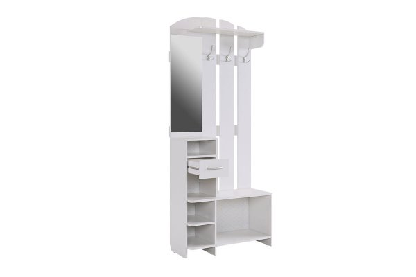 «Мила» создана для Вашей прихожей – Вы можете повесить одежду и сумку на металлические крючки, шляпки положить на полку сверху, нужные мелочи – в выдвижной ящик. На открытых полках можно разместить зонты, перчатки и шарфы. Есть зеркало и обувница.