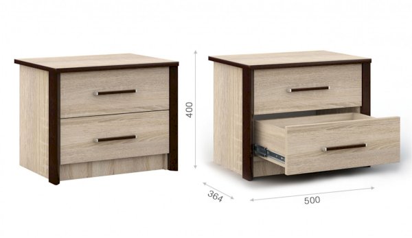 Прикроватные тумбы выполнены в стиле минимализм: строгие черты, функциональность и простота. Контрастный профиль из МДФ 22мм по внешним углам со скругленными краями для максимально безопасного использования мебели. Кромка цвета венге подчеркивают древесную текстуру и рисунок светлого дуба сонома, придает эффектный вид. Прикроватные тумбы с двумя ящиками на телескопических направляющих поместят в себя все вещи, которые важно иметь под рукой - телефон, светильник или любимая книга. Идеально дополняют кровать Эшли.