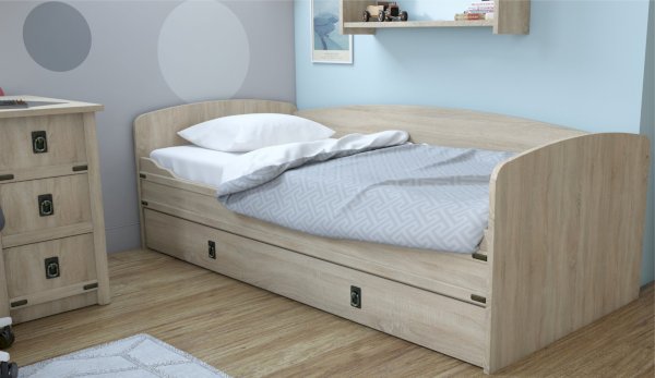 Кровать-тахта – со скругленным изголовьем и высокой спинкой имеет дополнительное спальное место, с помощью множества роликов его легко выдвинуть, можно использовать как ящик для белья. Мягкая кромка 2мм защищает края кровати от повреждений и сколов. Украшением служат стилизованные металлические ручки MARINE бронзового цвета и декоративные элементы в тон. В комплекте с декоративным матрасом и подушками превращается в молодежный диван. Пользоваться кроватью может взрослый и ребенок любого возраста, так как она имеет размеры стандартной кровати 90х200см, устойчивую конструкцию и нейтральный для интерьера цвет. Идеально компонуется со всеми модулями системы Валенсия.