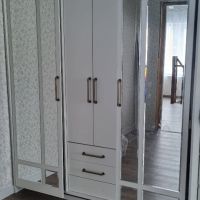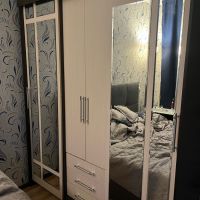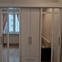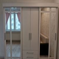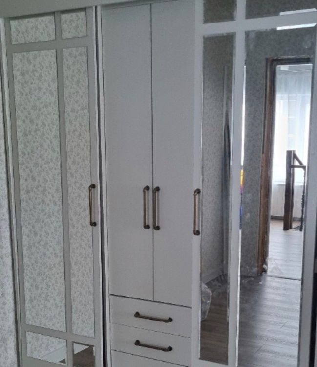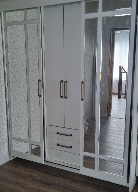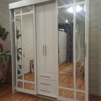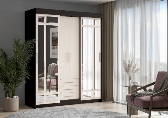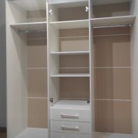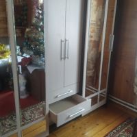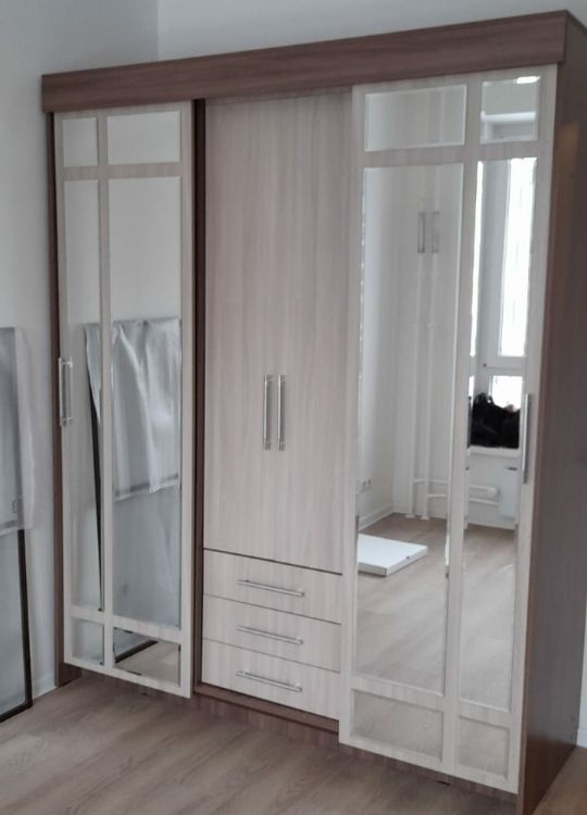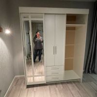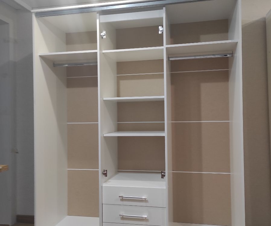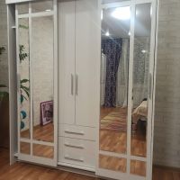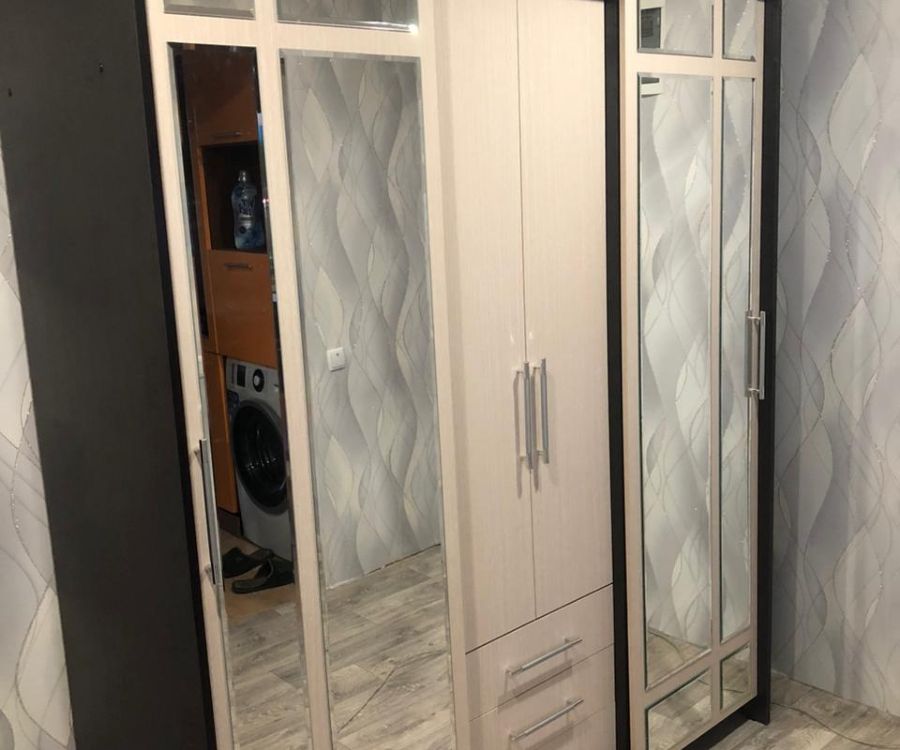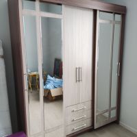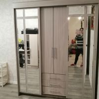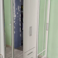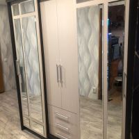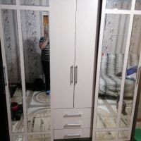 очень удобный многофункциональный шкаф купе с доп полками и выдвижными ящиками который ращделяется на три части что позволяет хранить вещи более удобнее