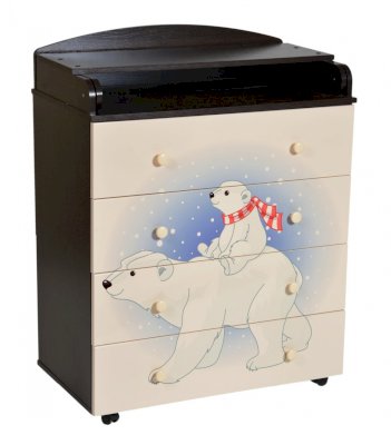 Венге/слоновая кость Пеленальный комод 800/4 Lilu 1 отличается привлекательным дизайном с использованием тематических детских принтов. В конструкции изделия предусмотрены 4 маленьких передвижных колеса, несколько вместительных ящичков на шариковых направляющих и откидывающаяся пеленальная столешница. Детский пеленальный комод, декорированный красочным рисунком, вмещает в себя постельные принадлежности, средства гигиены, распашонки, подгузники, игрушки, ползунки и другие личные вещи ребенка. Гладкая столешница идеально подходит для пеленания ребенка, а колесики позволяют быстро перемещать комод.