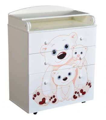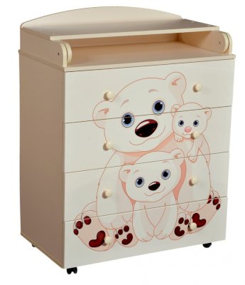 Пеленальный комод 800/4 Lilu 5 отличается привлекательным дизайном с использованием тематических детских принтов. В конструкции изделия предусмотрены 4 маленьких передвижных колеса, несколько вместительных ящичков на шариковых направляющих и откидывающаяся пеленальная столешница. Детский пеленальный комод, декорированный красочным рисунком, вмещает в себя постельные принадлежности, средства гигиены, распашонки, подгузники, игрушки, ползунки и другие личные вещи ребенка. Гладкая столешница идеально подходит для пеленания ребенка, а колесики позволяют быстро перемещать комод.