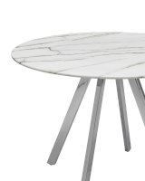 Обеденный стол с красивой стеклянной круглой столешницей белого цвета с рисунком под мрамор. Столешница гармонирует с металлическими ножками оригинальной формы. Такое сочетание смотрится эффектно в любом интерьере.