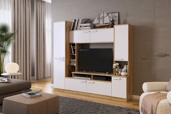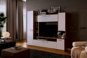 Мини-стенка «Токио»- находка для Вашей гостиной! Благодаря наличию большого количества открытых и закрытых полок, она заменит Вам полноценную стенку. Предусмотрено место для ТВ диагональю до 43 дюймов. Принтерный рисунок устойчив к воздействию ультрафиолета и истиранию. Качественная фурнитура порадует Вас долговечностью.