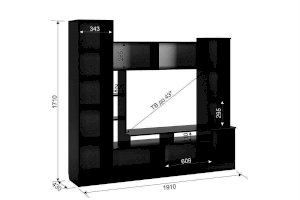 Состоит из: открытых полок, закрытых полок, ниши под телевизор